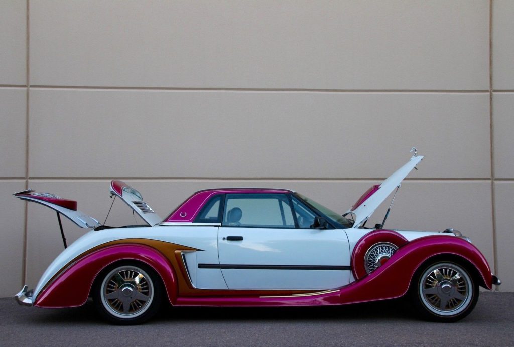 Clean engine compartment & clean trunk, clean interior, paint is in excellent condition, a 2 tone job – fine metallic white pearl and fine metallic raspberry with gold accents matching the wheels, the chrome is also in nice condition all around. Some original Riley parts were used, Headlights, Grill, Bumpers, the front & rear fenders are Riley, Riley running boards…looks like an original Riley was used in order to complete this sporty & cool Neoclassic, also a very nice prewar style hood ornament – Flying Lady – Packard style …..This is a beautiful turn key vehicle that needs nothing than a new owner, is ready for the road and will draw attention everywhere, a real head turner and a very nice conversation piece, if you see a guy in a Ferrari, you’ll say ” Yeah, another rich guy !!!” ….. but with this Riley is something else, everybody will take pictures, everybody wants to know what is it ? Pretty big & heavy vehicle, around 16 feet long bumper to bumper, a really good size for a roadster, this Riley is not your little average fiberglass”Kit Car” with a small 4 cylinder VW Beetle engine, this is a steel body – solid built vehicle that features a modern powerful drive train.