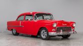 The restoration provided an absolutely straight exterior that was professionally reshot in a shade of red very similar to ’55 ‘Gypsy Red’. Chrome trim is in excellent condition and a resolute stance completes the stunning package. The only thing that rivals the exterior is the completely restored red/black vinyl interior. Every detail has been carefully addressed – late-model power bucket seats, custom console, headliner, door panels, carpeting – all carefully finished. The tilt-column mounts a Z28-style spoke wheel and the custom dash holds a complete set of Dolphin analog gauges, AutoMeter tach and AM/FM/Cassette stereo system w/power antenna. The 210 is equipped with tinted glass and air conditioning. Under the classic hood sits a built 383ci small-block stroker motor that sounds amazing. Enhancements include an Edelbrock aluminum intake, Holley double-pumper carb and electronic ignition. Exhaust is routed through tubular headers to a stainless system and an aluminum radiator w/electric fan manages cooling. Behind this Mighty Mouse sits a 5-speed manual transmission w/Hurst Comp+ shifter and 12-bolt differential with 3.55:1 gearing. The front suspension is equipped with tubular upper control arms, sway bar and power steering. Front disc/rear drum brakes are manual with an upgraded dual master cylinder. Nice period-correct 15” Cragar S/S wheels (7.5f/8.5r width) mount BFGoodrich radials.