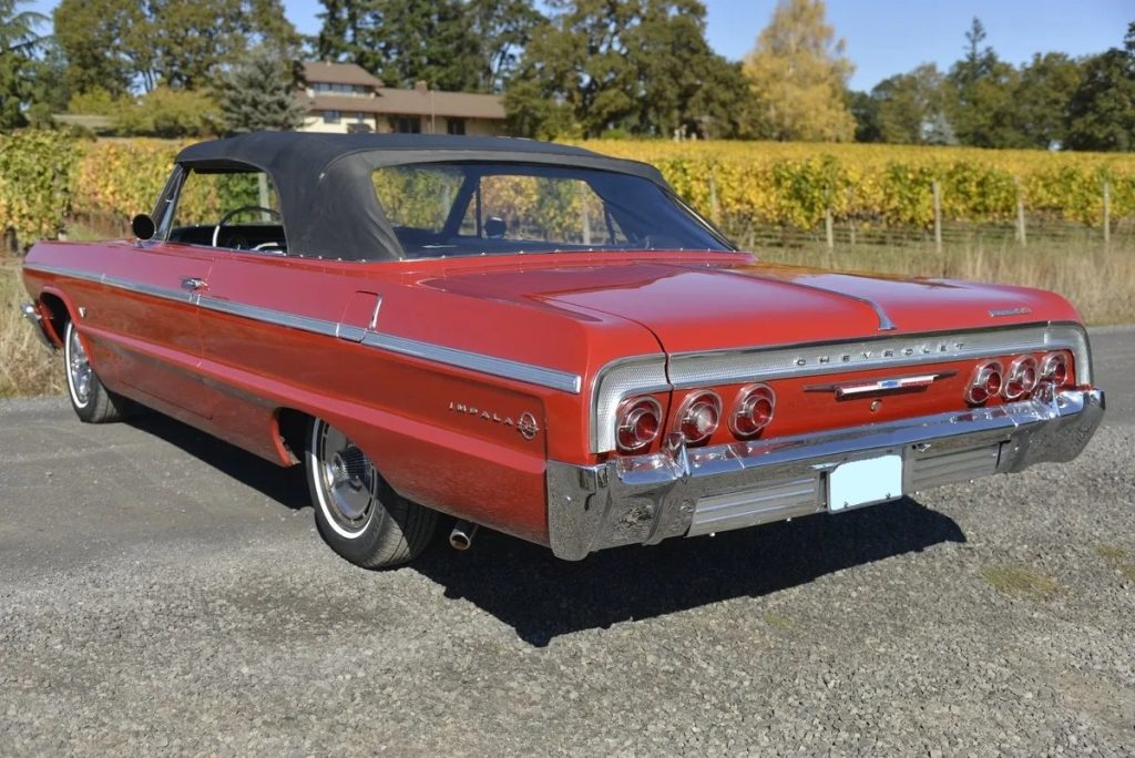 This 1964 Chevrolet Impala SS convertible is finished in Ember Red over a silver interior and is equipped with a powered black convertible top.
