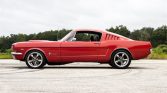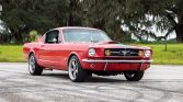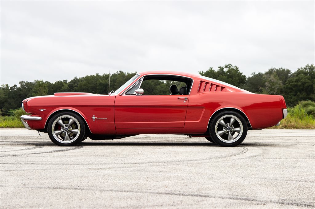 This beautiful 1965 Mustang fastback has timeless good looks and that fun to drive character that embodies the Mustang spirit. Painted in a vintage shade of red with a single silver stripe and matching painted five spoke painted wheels, this beauty sure is a head turner. The fastback lines make the car look fast sitting still, and the stance on this particular Mustang is just right! Under the hood of this pony is a classic 289CI Ford V-8…