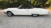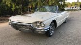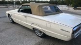 1965 Ford Thunderbird Convertible. Factory Wimbledon white car with black bucket seat interior. 390 4bbl V8 engine with automatic transmission and dual exhaust. Power windows, tilt away steering wheel, power driver’s seat, AM/FM radio, power antenna, Kelsey Hayes Wire Wheels, power steering, power front disc rear drum brakes, front bumper guards, fender skirts and dual outside rear view mirrors.