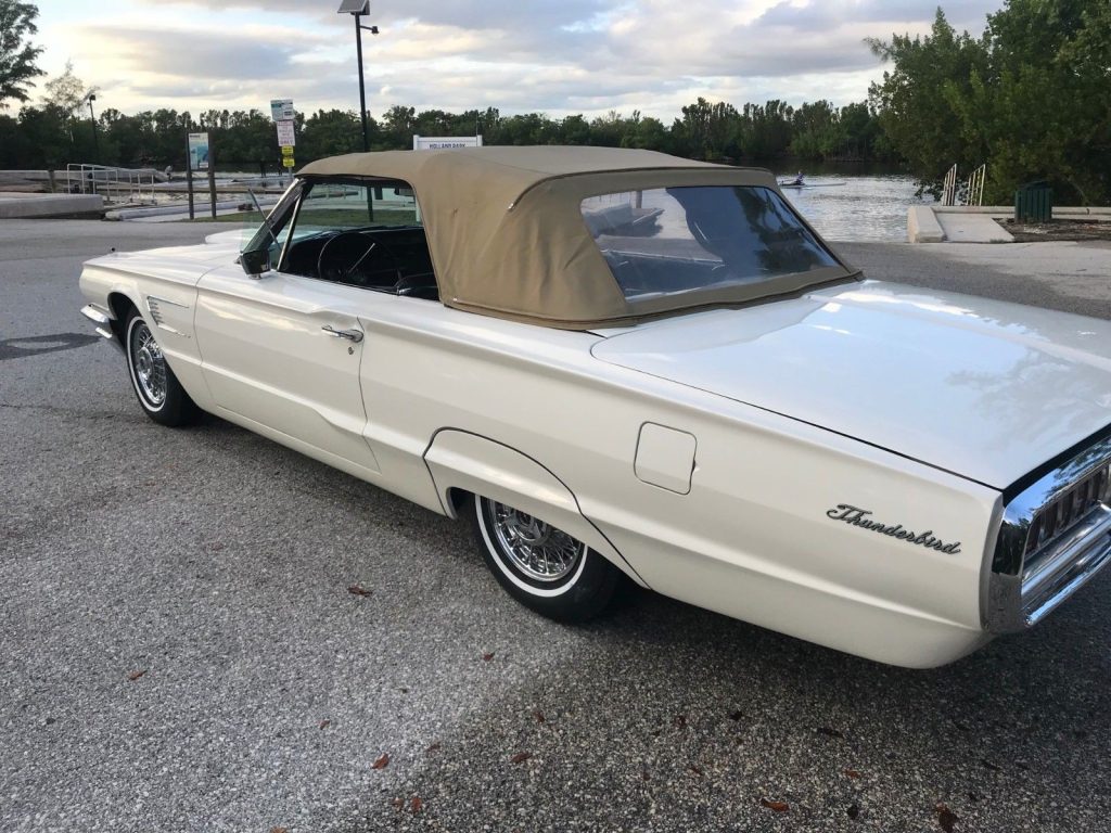 1965 Ford Thunderbird Convertible. Factory Wimbledon white car with black bucket seat interior. 390 4bbl V8 engine with automatic transmission and dual exhaust. Power windows, tilt away steering wheel, power driver's seat, AM/FM radio, power antenna, Kelsey Hayes Wire Wheels, power steering, power front disc rear drum brakes, front bumper guards, fender skirts and dual outside rear view mirrors.