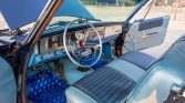 The car is powered by a 440ci V8 equipped with an Edelbrock carburetor and intake manifold paired with a four-speed manual transmission. It is finished in dark blue over blue vinyl upholstery, and additional equipment includes aftermarket air conditioning, a Bluetooth stereo, Doug’s headers, an aluminum radiator, a Hurst shifter, a dual exhaust system, and aftermarket chrome-finished alloy wheels.