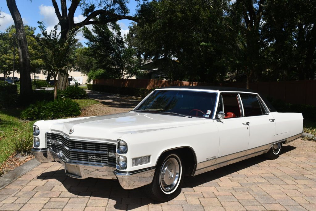 Very Rare 1966 Cadillac Fleetwood Brougham 4 Door Sedan :: Powered by 429 V8 Engine, Automatic Transmission, White Exterior with Black Vinyl Roof, Original Red Interior, Tilt & Telescopic Steering Wheel, Power Windows & Vents, Power Seat, Power Trunk, Cruise Control, Am/Fm Radio with Power Antenna, Rear Foot Rest with Writing Tables, Runs & Drives Amazing!