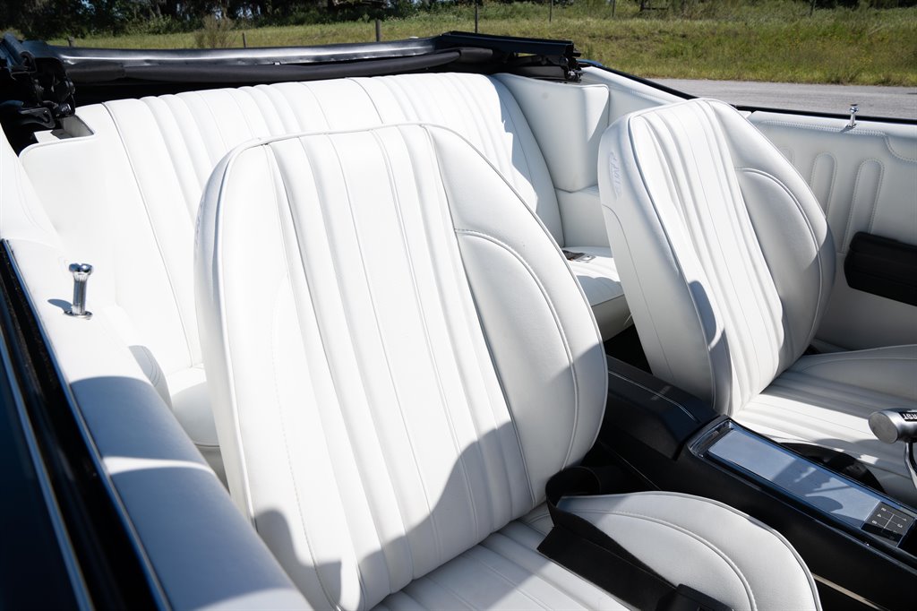 This classic Chevelle has been pulled out of the 20th Century and into the 21st courtesy of an all aluminum Chevrolet LS V-8 and a Tremec 6-speed manual transmission. If the engineers of the 60’s were alive today, this is THE driveline they would have selected to go in at the factory. Nothing is more fun to drive than a classic A-body with a modern fuel injected engine and a god’s honest 6-speed manual do it yourself transmission! Not leaving well enough alone, this Chevelle also received a powder coated frame, modern rack and pinion steering, coil over adjustable shocks, polyurethane bushings in the suspension, a rock solid 12-bolt axle, and 4 wheel power disc brakes(that was Corvette only stuff in 69′). Keeping with the clean and modern mechanicals, the aesthetics of this big boy brute in a tux were cleaned up with a shaved firewall, painted side stripes, a gorgeous powered cloth convertible top with glass rear window, and modern 18″ American Racing wheels wrapped in sticky modern radials. All this was bathed in a coat of Tuxedo black basecoat/clearcoat paint that has a shine a mile deep. They say beauty shouldn’t just be on the outside, so this Chevelle was made to be just as beautiful inside. A fresh TSI White vinyl interior with bucket seats was installed, along with modern Dakota Digital gauges, Autosound Stereo with Bluetooth, and a center console with a compartment to hide all the speeding tickets in. This Chevelle is the product of a multi year body off restoration that left no nut, bolt, or stone unturned. The only thing it needs is you behind the wheel!