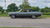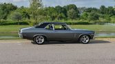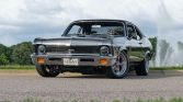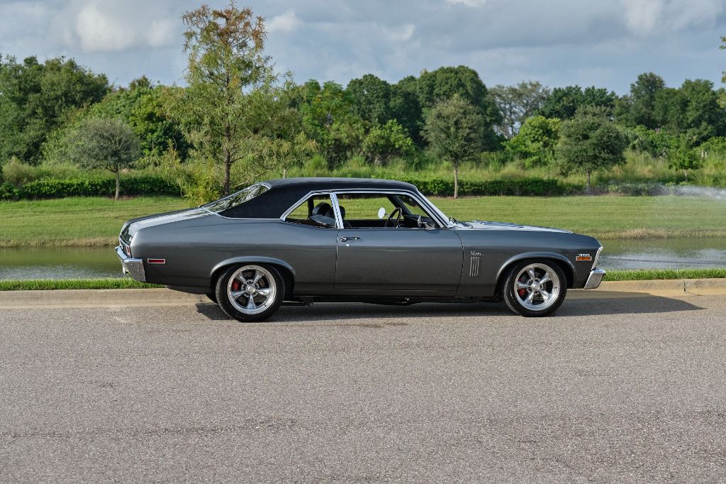 Shadow Gray paint job, laser-straight with exceptional fit and finish, showcasing the iconic lines of the Nova. This car retains its all-original GM sheet metal, adding to its authenticity and value. The new black interior features bucket seats and a center console, offering both comfort and a classic muscle car feel. Inside, the modern digital gauges keep you informed of the car’s performance, while the wood steering wheel* adds a touch of classic elegance.